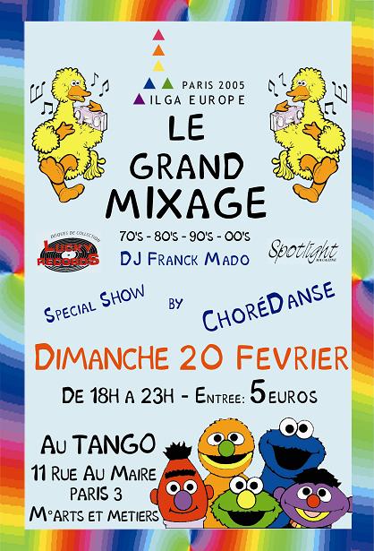 O Domingo 20 de Fevereiro, de 18 à 23, juntam-se à ILGA-Europe Paris 2005 ao Tango, para Grande Mixage. Com DJ Franck Mado e um Especial Show by ChoréDanse.
