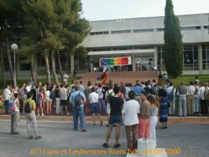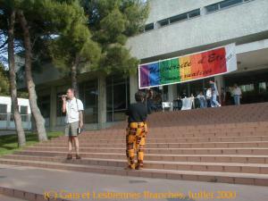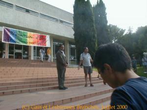 Chacun découvre les lieux de nos futurs débats, les grandes salles lumineuses ouvertes sur les pins, les cigales, dans une relative fraîcheur vu la récente tempête de mistral qui a occasionné des feux ravageurs dans notre Provence. Dès vendredi, les Gais et Lesbiennes Branchés étaient sur le pont pour