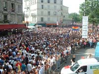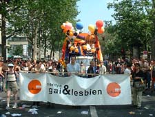 hétéros, homos, tous ensemble contre les discriminations : parentalité, séjour, travail, couple Le superbe soleil qui baignait la capitale cet après-midi là, et la promesse d'une chaude ambiance a attiré nombre de marcheurs. A 19 heures, la place de la République était noire de monde. Cette audience record place la Lesbian & Gay Pride de Paris au même niveau de participation que les plus grosses Pride européennes, comme celle de Berlin où Cologne. Une participation politique très importanteLes hommes politiques aussi se sont pressés au départ de la manifestation. Tous les partis de la gauche plurielle étaient représentés. Le Parti communiste a dépêché sur place Robert Hue, son secrétaire national, ainsi que Nicole Borvo, sénatrice de Paris et présidente du groupe communiste du Sénat, et Michela Frigiolini, membre du collège exécutif. Les Verts étaient représentés par Alain Lipietz, député européen et leur candidat aux prochaines élection présidentielles, et par Noël Mamère, député. Le Parti socialiste était représenté par son porte-parole, Vincent Peillon, et par le premier secrétaire de la fédération de Paris, Patrick Bloche, député de Paris. Les partis de droite ont été beaucoup moins représentés. Trois secrétaires nationaux de l'UDF ont marché à titre personnel : il s'agit de Philippe Meynard, conseiller municipal de Barsac (Gironde), Frédérique Dumas, secrétaire nationale à la Culture et à la Communication, et de Mouloud Ould Jahoui, secrétaire national à l'intégration. Alain Madelin, président de Démocratie Libérale, s'est fait représenter par sa directrice de cabinet, qui a tenu à porter la banderole de tête. Enfin, la direction du RPR n'était pas représentée. Jean-Luc Romero, conseiller régional RPR Ile de France, participait en tant que président d'ELCS. Mais la personnalité qui a fait le plus sensation a été sans conteste celle de Bertrand Delanoë, dont c'était la septième participation, mais la première en tant que Maire. La présence du premier magistrat de la ville de Paris a d'ailleurs été saluée par de nombreux applaudissements tout au long du parcours. Bertrand Delanoë était entouré d'un nombre important d'élus parisiens, aux premiers rangs desquels Anne Hidalgo, première adjointe, les adjoint-e-s Clémentine Autain, Christophe Girard, Marie-Pierre de la Gontrie, Danièle Hoffman-Rispal, ainsi que Dominique Bertinotti, Maire du IVème arrondissement, Michèle Blumenthal, Maire du XIIème, Jacques Boutault, Maire du IIème, Philippe Ducloux, premier adjoint du XIème, et Christophe Najdovski, président du groupe des Verts du Conseil de Paris. Toutes les associations homosexuelles ou presque
