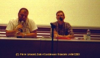 la vie privée, la vie Dés les premières minutes, les interventions fusent, les questionnements, les témoignages qui n'ont souvent pas d'autres lieux pour s'exprimer. L'intégration sociale perçue par une partie de gais et des lesbiennes au travers des actions politiques, du pacs, ne fait pas l'unanimité. Être intégré dans la société est-ce être digéré, fondu ? Les gais et les lesbiennes ont semble-t-il toujours cette culture de la différence. Le modèle social actuel ne satisfait pas : trop de remise en cause, dont certaines fondamentales sur la sécurité sociale, les 35 heures, mais quel est le rapport avec l'homosexualité. Le PACS concentre les critiques par son pouvoir d'identification au modèle hétérosexuel. La fin des discriminations ne passe pas forcément au travers du filtre républicain de statuts spécifiques et de droits dérivés. La société s'est construite sur des exceptions, des statuts spécifiques qui s'héritent, se dérivent. Le débat humaniste est plutôt là. Malheureusement, même si la République se veut universelle, le clientélisme ne permet pas d'aborder tout les sujets. Les droits dérivés devraient être révisés, individualisés, découlant du constat : parce que je suis ! Le ton du cycle est donné, anti-mondialiste, anti-intégration, un brin anarchiste mais pas trop. la formation associativeAprès Jean Michel Dariosecq, le FAG, association de formation anime un cycle d'atelissr dédiés à la vie des associations. Comment faire pour grossir, pour cadrer ses objectifs, René-Paul Leraton, animateur de la ligne Azur, rompu aux discussions ouvertes, distille des bonnes paroles lisses, pas un cheveu ne dépasse. On peut regretter que les questions "complexes" soient souvent redirigées vers un entretien individuel. Pour un cycle de 5 ateliers de 2 heures certains ont du imaginer qu'il y avait du temps pour travailler sur quelques vrai sujets récurrents. Le FAG vit de ses journées de formation est-ce la déformation liée au modèle économique ? Les jeunes Le thème qui domine cette UEH est sans contexte