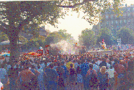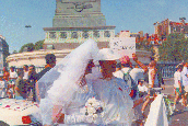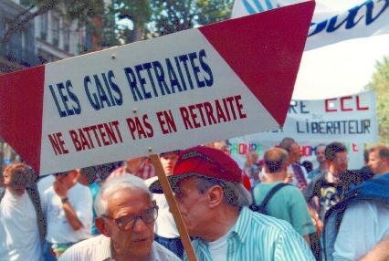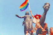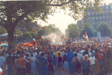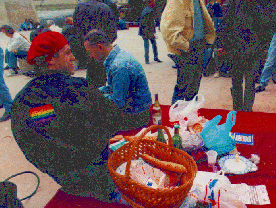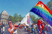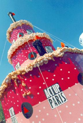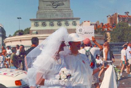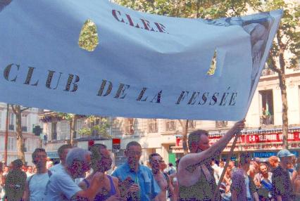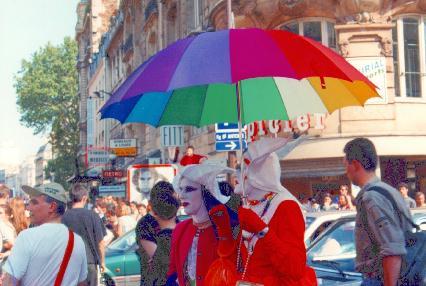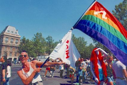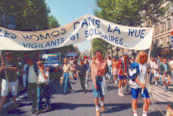 But, what image did we offer to the crowd and the media, in addition to this huge number? Mainly, "Fun and Aids", more a Parade than a March, with the american meaning of the "March on Washington", or "The March on the United Nations". However, it was a special opportunity: 25 years after Stonewall, 4 months after the Europarliament resolution (based on the Roth report), one week after the european elections, one week before the March on the U.N.. On such topics, very few (or no) slogans could be heard or seen. I believe that this opportunity, both of a revival of a political awareness and of putting forward another image, has been missed. I don't know to what extent it was this awareness which moved gays and lesbians to the march. It can be more accurately measured by the participation to the discussion panels organized at the new "Centre gai et Lesbien" all along the Pride Week (which were successful), to the demonstration against the homophobic italian candidate, or to the picnic in place of the yearly Salon de l'Homosocialite, not permitted this year; at most a few hundreds attended any of these events, which didn't get any coverage from the media.
