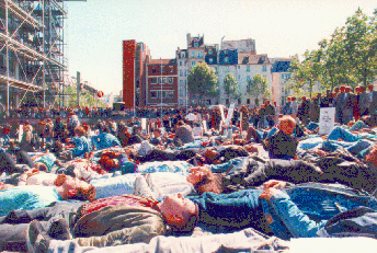 This Day of Desperation (Journée du désespoir) was organized by Act Up for the second time in Paris, on Saturday, May 21. Some 500 people gathered on the square in front of Centre Georges Pompidou for a die-in.