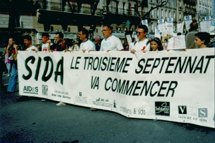 Heading the procession, a banner said ``AIDS : the third seven-year term is beginning'' (french presidents are elected for seven years), and demonstrators proclaimed ``Vote seropo'' holding placards with ``Infected under Mitterand, dead under Jospin'' (or Balladur, or Chirac, according to the picture of one of the main candidates).