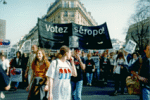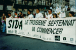 En tete des cortèges marchait une banderole sur laquelle on pouvait lire : ``Sida : le troisième septennat va commencer''. Les manifestants brandissaient de grandes pancartes noires proclamant ``Affaire d'Etat, affaire de tous'', ou encore, ``Infecté sous Mitterand, mort sous Jospin'' (ou Chirac, ou Balladur, selon la photo d'un des trois candidats sur laquelle était inscrit ce slogan) et scandaient ``Votez séropo'' ou encore ``23.000 morts, les candidats en veulent encore''.