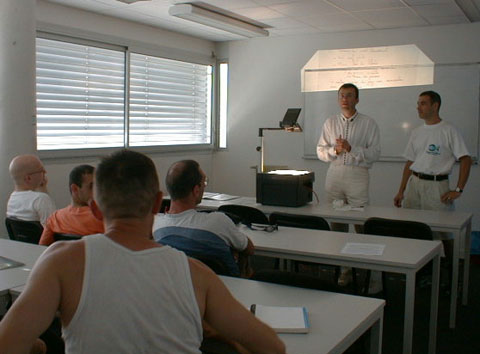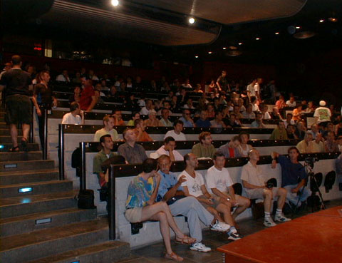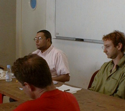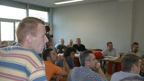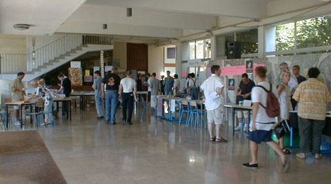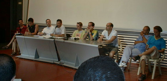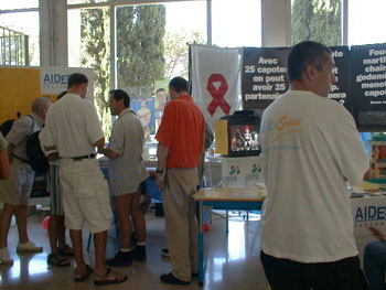 Ce Dimanche 25 juillet a été finalement bien rempli. Dès 11 heures, avant l'arrivée des participants, une réunion informelle sur pelouse réunissait les associations participantes des ateliers, afin d'accorder les violons avec les organisateurs. Jacques Fortin profitait de l'occasion pour informer sur les coulisses d'une préparation pas toujours facile, que ce soit sur la suspicion administrative pour accorder un emploi jeune à la dernière minute, bien que réclamé depuis plusieurs mois, ou sur les bus promis par la Mairie mais finalement absents, etc. L'homophobie administrative en France est toujours aussi rampante! L'UEEH a exigé d'être reçue es qualité par la Mairie, refusant les arrangements d'étiquettes, et son président est heureux d'annoncer qu'elle est la première association gaie reçue en tant que telle par la municipalité Gaudin. Cet exemple est a méditer pour chacun, ainsi que l'exigence d'avoir désormais un interlocuteur, "Mr ou Mme Gay", en Mairie. Jacques Fortin abordait ensuite la mise en perspective des futures UEEH pour les partenaires potentiels associatifs. Des cahiers devraient paraître, avec les contributions de chacun, avant les UEEH pour les préparer, et après pour en faire le bilan. D'autre part, les UEEH devraient avoir 3 volets : un thème annuel porteur, en harmonie avec les préoccupations militantes gaies de l'année, un éventail d'initiatives individuelles d'ateliers ou de colloques, et une programmation ludique et sportive. Il évoquait également le désir que l'équipe ne soit pas un cartel d'associations, mais des gens motivés pour travailler toute l'année, avec un réseau interassociatif au caractère méditerranéen fort, le tout verrouillé pour rester efficace. ![]() le patio de la cafeteria L'après-midi permettait de revoir le salon des associations, tandis que les ateliers se mettaient en place. Le cybercafé avançait son installation, avec l'aide de Verte Fontaine qui nous a trouvé les rallonges électriques indispensables. Désormais deux machines sont en ligne, France Télécom complétera lundi ses fournitures pour une troisième. Cette activité ne permettait pas trop de déambuler, mais il faut signaler parmi les participants la librairie PAIDOS à Marseille, qui a fait un effort méritoire pour proposer des ouvrages rares et de qualité, que les provençaux vont habituellement acheter aux Mots à la Bouche à l'occasion de visites parisiennes. Cet effort sera suivi d'un rayon permanent, chez un libraire qui s'intéresse habituellement à l'éducation, la sociologie et autres sujets universitaires. ![]() le salon des associations ![]() un exposant quasi-institutionnel... La rencontre d'un jeune roumain parlant parfaitement le français permettait de faire connaissance avec les difficultés de ce pays, où les relations homosexuelles valent 5 ans de prison minimum, et quelquefois une interdiction professionnelle. Nul doute que les gays et lesbiennes de ce pays doivent être aidés, d'autant que son entrée au conseil de l'Europe le rend sensible aux pressions internationales, nous y reviendrons. Notez déjà l'adresse de l'association ACCEPT à Bucarest, https://accept.ong.ro, qui a des pages en anglais, et bientôt en français. Un article sur le Roumanie vous sera proposé durant l'UEEH, grâce à cette rencontre. L'après-midi voyait ensuite les séminaires se mettre en place. Un séminaire sur la presse lesbienne, bien fréquenté, où un garçon s'était glissé, et un autre sur le sport et l'homosexualité, secteur désormais reconnu dans la communauté. ![]() le séminaire sur la presse lesbienne ![]() le séminaire sur le sport et l'homosexualité Le séminaire sur le PACS, l'état législatif de la question et la stratégie actuelle, l'après-pacs, animé par Gérard Bach-Ignasse et Yves Roussel, a eu un succès considérable, réunissant une bonne partie des ténors nationaux et régionaux de la communauté. ![]() le séminaire sur le PACS ![]() le séminaire sur le PACS : visages connus. ![]() le séminaire sur le PACS : Gerard Bach-Ignasse et Yves Roussel En cette fin d'après-midi, nul doute que l'UEEH a enfin démarré pour de bon. Les organisateurs sont moins inquiets, plus attentifs aux petits soucis des bénévoles, les choses se mettent en place, le contenu tient la route, et les anciens ont retrouvé aujourd'hui cette ambiance mélangée de travail dense et fructueux et de farniente au soleil. Les nouveaux semblent un peu surpris de la qualité des intervenants et des échanges, hier encore on se demandait un peu comment ça allait tourner. Le restau U a fait le plein encore ce soir, chacun voulant rester pour le forum nocturne. ![]() repas au restau U 21 heures dans l'amphi, moment d'annonce des petits détails d'intendance puisque tout le monde est là, interruption ludique et satirique de Madame H, présidente-secrétaire-trésorière activiste de "Homosexualité et Bourgeoisie", confrontée à la découverte de la pauvreté chez les gays (ou des gays parmi les pauvres), qui nous raconte comment relooker un prolétaire pour l'inviter à un vernissage. Tout le monde se tord, les trouvailles sont féroces. ![]() Mme H, "homosexualité et Bourgeoisie" Morceau de bravoure ensuite, le forum sur les témoignages méditerranéens. Modéré par Amnesty International, le forum commence par un exposé sur la position d'Amnesty en ce qui concerne le combat pour l'orientation sexuelle, et la difficulté d'un consensus international sur ce sujet. Les pays opposants sont d'ailleurs ceux qu'on va retrouver un instant plus tard, dans la démonstration que l'humanité ne traite pas toujours avec honneur ses semblables, surtout s'ils sont gays. ![]() les intervenants Pour témoigner sont présents le Portugal, l'Espagne, la Grèce, l'Italie, où les lois ne sont pas si féroces, mais le poids des moeurs encore très sensible, avec des cas d'ostracisme souvent très méditerranéens. Mais lorsque vient le tour 