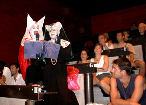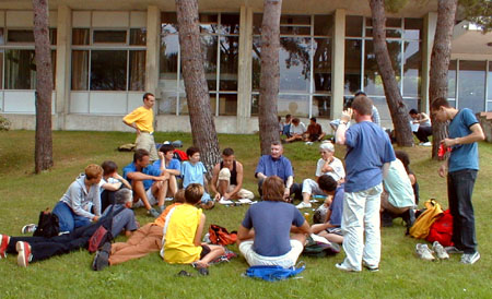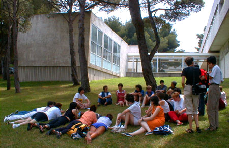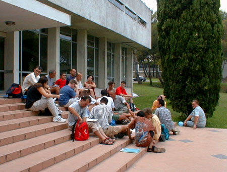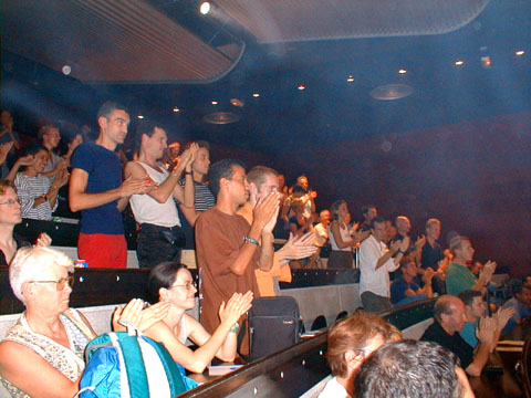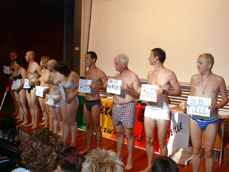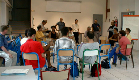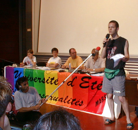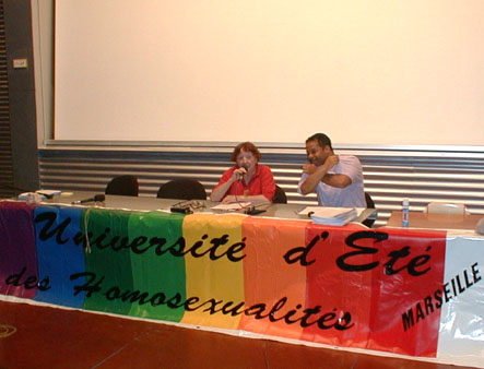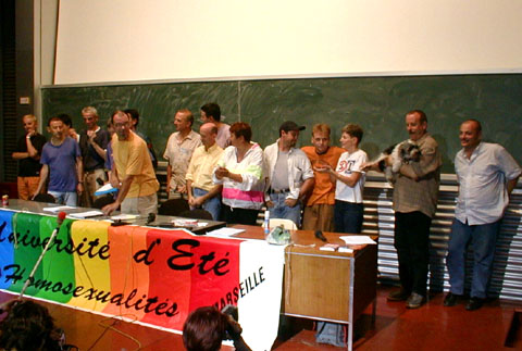 Ce Vendredi est consacré aux bilans des uns et des autres. Plus de salles de réunions, chacun rassemble ses ouailles sur un coin de pelouse, ce n'est pas la verdure qui manque. Dès le matin, coordination générale du groupe inter-universitaire sur les marches de l'école. Un appel à la création d'un réseau inter-universitaire des études et enseignements sur "genres et sexualités" est lancé, notamment avec l'aide d'internet, l'adresse d'un coordinateur est communiquée pour tout contact, et une page web sera installée. ![]() Le groupe des universitaires Suit un regroupement avec les associations, où Jacques Fortin indique les directions de travail que les organisateurs retiennent. Il y aura durant 5 ans un CA de 25 personnes physiques cooptées, entouré d'un réseau associatif consultatif. Jacques estime que cela est suffisant pour assurer la pérénité des UEH, ensuite, la contestation de la direction sera ouverte... L'UEEH de l'an 2000 se tiendra à Marseille du 22 au 29 Juillet, réservez vos dates... ![]() La coordination avec les associations Sur l'ensemble des travaux réalisés durant l'UEEH, il est demandé à chacun de faire un bilan, et les contributions complémentaires seront offertes aux cahiers de l'UEEH, les auteurs gardant leurs droits par ailleurs. Ces cahiers seront vendus au profit de l'UEEH. La cafet est en train de fermer, le CGL de Marseille déménage les frigos, la direction de l'école des Beaux-Arts va partir en vacances, et vient voir l'état des lieux. Elle a trouvé cette dernière semaine très gaie (!), mettant de l'animation dans l'école, et le CGL a reçu un bouquet de fleurs et une invitation "à l'année prochaine". D'autres groupes font leur bilan, en particulier les lesbiennes et un regroupement de dernière minute des enseignants. ![]() Les lesbiennes tirent le bilan de l'UEEH ![]() Le groupe Education Nationale, avec Jacques Gary L'après-midi au forum est inaugurée par un nouveau parti politique, "Les Mauves", qui entend présenter des candidats aux élections, notamment municipales, et entretenir le débat dans le monde politique professionnel, en apportant la vision du monde et de la société des gays et lesbiennes. Bleu et rose font mauve à l'heure où les partis prennent des couleurs. ![]() "Les Mauves", parti présenté par Geneviève Pastre et Louis Georges-Tin Le Forum de clôture est ouvert par Jacques Fortin, qui demande à toute l'équipe d'organisation de le rejoindre, remercie les bénévoles supplémentaires et les participants, et se dit soulagé d'avoir mené le bateau à bon port. ![]() Jacques Fortin et ses complices Un tonnerre d'applaudissements a témoigné de la reconnaissance des participants. Tout l'amphithéâtre s'est levé pour manifester l'émotion d'une telle réussite, un événement fort qui a donné à chacun des souvenirs intenses et l'envie de revenir. On oublie les couacs de l'organisation, on retient la relance d'un espace enrichissant de réflexion et de fête, dont chacun a compris la nécessité pour tous, et qui l'emporte largement. Enfin Jacques Gary nous annonce son retrait de la vie militante. ![]() L'assemblée, émue, s'est levée pour applaudir Chacun présente alors son bilan de la semaine. Les jeunes étudiants gays parisiens d'Etudions Gayment font part de leur surprise, ils étaient venus pour le côté festif, mais veulent désormais contribuer. Ils se sont bien amusé, ils ont appris beaucoup de choses et rencontré beaucoup de monde, ils sont enchantés. Ils reviendront l'année prochaine, proposeront des ateliers, et probablement une soirée techno... c'est la colo la moins chère et la plus intéressante qu'ils ont trouvé. Quant au MAG, autre groupe de jeunes gays parisiens, ils sont plus politisés (ils sont le fer de lance des relations gays avec le Ministère de la Jeunesse et des Sports, et leur président est vice-président de l'IGLYO - internationale des jeunes gays). Ali est enchanté de tout ce qu'il a appris sur l'histoire du mouvement, il a eu assez peur de la radicalité des contestations politiques, dans un paysage militant qu'il croyait inhabité. Un peu secoué, mais motivé pour revenir en force lui aussi. ![]() les jeunes, représentés par "Etudions Gayment" Du côté de l'éducation Nationale, un travail amorcé à l'UEEH continuera ces prochains mois, avec l'aide d'internet, et permettra en Janvier de poser les bases d'un séminaire pour l'an prochain. Le groupe universitaire annonce un travail de fond qui démarre, pour faire un répertoire de l'existant, et un séminaire à Toulouse en Janvier. Les lesbiennes annoncent que leur fête a attiré 220 copines, dont 40 de l'UEEH, et que le concert des Belladonna leur a plu. Un groupe de radios libres a établi des liens nationaux, et envisage de sonoriser l'espace l'an prochain, voire d'émettre sur Marseille pendant l'UEEH. ![]() Le groupe d'expression ZOO se déshabille et fait son bilan en silence, comme il se doit. Pour le bilan de l'Internet, je dois bien dire que le cybercafé n'a pas bien fonctionné, car lancé trop tard et mal coordonné techniquement. Par contre, la couverture journalistique assurée en exclusivité par la FQRD est un franc succès, en partie dû à l'absence des médias gays reconnus, qui ne sont même pas venus! Surtout, le lancement d'une liste de diffusion commune à tous les participants branchés permettra de jouer les prolongations, et les échanges de solidarité avec nos amis étrangers sont prometteurs. Les marocains et algériens adressent leurs remerciements pour l'accueil chaleureux qu'ils estiment avoir reçu, expriment le sentiment de s'être sentis "chez soi" parmi nous, et repartent ragaillardis, certains que les liens tissés autour de la Méditerranée auront une suite. Notre roumain est heureux des nombreux contacts établis, et demande à tous les particuliers et associations de leur envoyer des livres en français, même en mauvais état, pour créer un fond fran