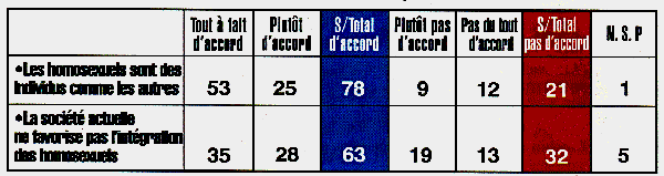 On note aujourd'hui une consolidation de l'attitude de tolérance à l'égard des gays puisque notre sondage révèle que 78 % des Français sont tout à fait (53 %) ou plutôt d'accord (25 %) avec l'idée que "les homosexuels sont des individus comme les autres". En mai 93 dans un sondage "Ifop-Globe hebdo", 70 % de la population considérait que l'homosexualité "était une manière comme une autre de vivre sa sexualité" mais selon cette même enquête, seuls 51 % des Français éprouvaient de la sympathie pour les homosexuels. La tolérance vis-à-vis des gays semble donc être régulière et fait nouveau porte non plus sur la seule sexualité comme dans le sondage "Ifop-Globe Hebdo" mais sur les homosexuels comme individus. Une évolution significative si on se rappelle qu'en 1986 seuls 54% des Français admettaient cette autre sexualité. Comme c'est souvent le cas pour toute question qui a trait aux moeurs on constate que la tolérance est plus forte chez les femmes (56,8 % contre 49,6 chez les hommes) et chez les jeunes. (69,6% chez les moins de 25 ans contre 33 % chez les 65 ans et +). Parallèlement à ce phénomène mais de façon moindre les Français reconnaissent à 63% (35% tout à fait d'accord et 28% plutôt d'accord) que la société actuelle ne favorise pas l'intégration des homosexuels. Un chiffre édifiant qui pointe bien les lacunes de la reconnaissance des gays dans un pays qui ne passe pourtant pas pour homophobe.