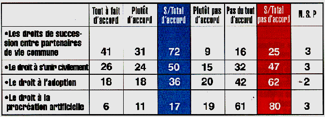 Si les Français font le constat que la société actuelle ne favorise pas l'intégration des homosexuels, ils restent pourtant très partagés quant aux applications pratiques de cette intégration. C'est dans le domaine des droits que les disparités sont les plus criantes. Ainsi 72 % des Français sont favorables au fait d'accorder aux homosexuels "le droit de succession entre partenaires de vie commune". Ils étaient 74% dans un sondage réalisé en 1991 par Ipsos, Gai Pied Hebdo et le Collectif du Contrat d'Union Civile. Ce qui marque là encore une bonne stabilité. Cependant, l'union civile pour les gays semble faire moins recette puisque le chiffre est passé de 72% d'opinion favorable en 1991 (Sondage Ipsos, GPH et Collectif du Cuc) à 50 % dans notre sondage. En 1995, 47% des Français (15% plutôt pas d'accord et 32% pas du tout d'accord) sont opposés à l'octroi aux gays du droit à s'unir civilement. En mai 92, un sondage Ipsos - GPH - Collectif Cuc révélait que 46 % des Français étaient d'accord avec le fait que "les concubins homosexuels devraient avoir les mêmes droits que les autres concubins". A propos de l'adoption par les couples gay et lesbiens, le verdict est sévère : c'est un refus pour 62% des Français. Là encore les hommes sont plus opposés que les femmes à cette mesure (64,3% contre 60,2%) et les personnes de 50 à 60 ans davantage que celle de 25 à 34 ans (72,8% contre 57,5%). Quant à la possibilité d'avoir accès à la procréation artificielle, c'est un désaccord quasi complet à 80% (78,1% des hommes y sont opposés et 80,9 des femmes).
