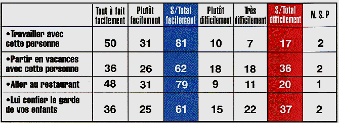 Lorsque l'on interroge les Français sur des situations plus pragmatiques de la vie quotidienne qui pourraient les mettre en contact avec des homosexuels, la tolérance décroît quand le degré d'intimité augmente. 81 % des Français peuvent travailler facilement avec un homosexuel (les femmes très facilement à 56,4% et les hommes très facilement à 42,4%), 79 % iraient au restaurant mais on descend directement à 62 % lorsqu'il s'agit de partir en vacances. Lorsqu'il s'agit de confier la garde de ses enfants, de fortes réticences quasi égales se font sentir chez les hommes (38,1%) que chez les femmes (36,1%). Encore une fois, on constate que les Français sont plus réticents avec les gays dès lors qu'il s'agit de situations plus intimes, moins théoriques donc plus impliquantes. Par ailleurs, beaucoup de Français jugent seulement "plutôt facile" l'exercice de certaines relations sociales (travailler avec un gay : plutôt facile pour 31%, partir en vacances avec un gay plutôt facile pour 26%...), ce qui indique bien une certaine restriction...