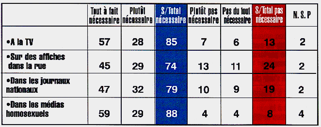 Concernant les campagnes de prévention contre le SIDA qui s'adresseraient directement aux homosexuels, 88 % des Français pensent qu'il est nécessaire d'en réaliser dans les médias homosexuels. En revanche, et là, le chiffre est fort intéressant, 85 % des personnes interrogées estiment nécessaire la présence de ces campagnes à la télévision, média touchant le plus grand nombre. Un choix que l'Etat s'est pourtant toujours refusé à faire au motif que cela pouvait heurter l'opinion publique dans son ensemble ou que le public n'était pas "prêt" pour ce type de campagne. Le chiffre d'aujourd'hui tend à affirmer le contraire. Suivent enfin, à 79 % la nécessité de prévention en direction des gays dans les journaux nationaux, et à 74 % sur des affiches dans la rue. Ces deux chiffres sont un peu plus faibles que les deux précédents mais peuvent tout de même être considérés comme encourageants.