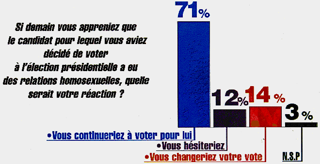 Enfin, une petite question subsidiaire en cette période de sondages électoraux et à quelques jours des prochaines élections présidentielles. A la question "Si demain vous appreniez que le candidat pour lequel vous aviez décidé de voter à l'élection présidentielle a eu des relations homosexuelles, quelle serait votre réaction ?" 71 % des interrogés ont déclaré qu'ils continueraient à voter pour lui. Le chiffre paraît de prime abord intéressant mais tout est relatif. Le revers de la médaille, c'est que 14 % des interrogés changeraient leur vote et 12 % hésitent. Dans un sens, les 26 % qui pèsent dans l'autre plateau représentent une personne sur quatre qui changerait ou remettrait en cause son vote. Ce chiffre est loin d'être enthousiasmant puisqu'en dépit de tout autre paramètre de choix, l'homosexualité seule serait aux yeux de certains électeurs un critère disqualifiant.