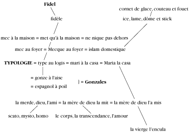 Dans un éclair, il pensa à ce con de Typologos, à ses théories à la, et il sourit on se disant cela, à la mord moi le noeud, à sa vierge mystique.