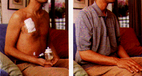 Dans les deux cas, mieux vaut que l'embout soit placé assez bas sur le thorax : il sera plus facile à utiliser par le patient. Il faut aussi savoir si celui-ci est droitier ou gaucher.