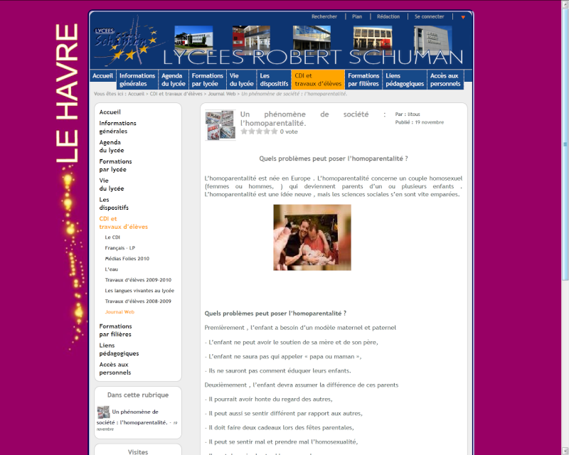 Le lycée Robert Schuman, au Havre, a publié le 19 novembre un article dans son "journal web" intitulé "Quels problèmes peut poser l’homoparentalité ?", et véhicule de nombreux clichés : "l’enfant ne saura pas qui appeler papa ou maman", "ils ne sauront pas comment éduquer leurs enfants", "[l’enfant] pourrait avoir honte du regard des autres", "il doit faire deux cadeaux lors des fêtes parentales"...