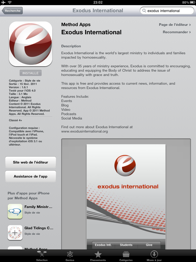 Apple n’a pas réagi officiellement à la campagne de protestation, mais un début de ménage a été fait discrètement dans l’App Store, car l’application, qui était téléchargeable sous le nom de Gay Cure a disparu. Elle est désormais accessible sous le nom beaucoup moins tapageur d’Exodus International. Combien de milliers de signatures supplémentaires seront nécessaires pour que la firme à la pomme, qui prétend contrôler tout ce qui s’exécute sur ses machines, fasse le ménage dans sa boutique ?