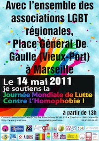 - Une vingtaine de stands d’associations : G-stud, Le Refuge PACA, Lulu-Berlu, FAG, UEEH, 3G, CEL, System Gay, L’autre Cercle PACA, AIDES, David&Jonathan, MJS13, Gay-Marseille, Amnesty international, Les soeurs de la Perpetuelle indulgence, HES, Frontrunners Marseille, Festival Reflets. En collaboration avec la Ville de Marseille et le Conseil Général des Bouches-du-Rhône.