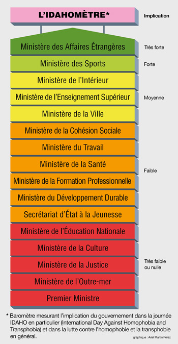 En 2011, le ministère des Affaires Etrangères est le mieux placé sur l’échelle. « Autrefois peu visible dans ce domaine [sur les questions LGBT] , la France est aujourd’hui reconnue comme étant l’un des pays les plus actifs sur la scène internationale » se félicitent les responsables de l’IDAHO.