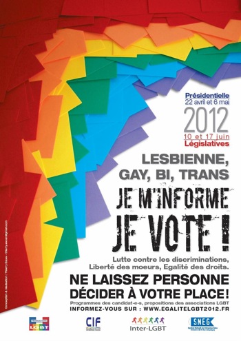Dans le cadre de la campagne EGALITE LGBT 2012, non partisane, le SNEG (Syndicat National des Entreprises Gaies) va diffuser au sein de son réseau, en partenariat avec les 3 grandes fédérations d’associations, des affiches et des flyers, incitant au vote, sous le slogan : "Je m’informe, Je vote ! Ne laissez personne décider à votre place ! ".