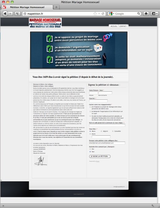 Beaucoup de maires de France ne sont pas prêts à célébrer des mariages entre personnes de même sexe. Jacques Bompard, maire d’Orange et député du Vaucluse, va plus loin, en demandant l’instauration d’une clause de conscience pour les élus, qui leur ménagerait un droit de retrait. Pour soutenir cette idée, il a lancé une pétition en ligne, consultable à l’URL http://mapetition.fr/.