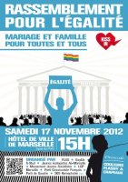 Pour soutenir le projet de loi ouvrant le mariage aux couples de personnes de même sexe, les associations de la Coordination régionale LGBT PACA mobilisées en faveur de l’Egalité, donnent rendez-vous le 17 novembre à 15h devant la Mairie centrale, sur le Vieux-Port.