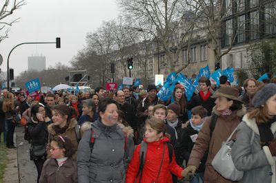 Des flots de manifestants, surtout des familles avec père, mère et enfants, et des personnes agées, venus en bus ou en TGV spécialement affrêtés ont marché tout au long de l’après-midi pour exprimer leur désaccord. Ils brandissaient des pancartes et reprenaient des slogans dans lesquels ils exprimaient leur rejet du projet de loi ouvrant le mariage à tous les couples, et surtout, ses conséquences sur la filiation. Petit florilège :