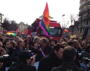 Mais ceux qui auront probablement créé l’image de cette manifestation, ce sont les députés socialistes Yann Galut et Nicolas Bays, qui se sont embrassés. « On est tous les deux hétérosexuels, on assume tous les deux, mariés avec des enfants. Mais aujourd’hui, avec ce bisou de solidarité, on a voulu dire nous, en tant que parlementaires, en tant que députés qui allons commencer la bataille législative dans deux jours, que nous sommes solidaires des homosexuels, que nous sommes solidaires de leurs revendications », a déclaré Yann Galut.
