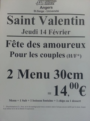 Jeudi 14 février, à l’occasion de la Saint Valentin, le Subway d’Angers Saint-Serge, quartier universitaire, a lancé une offre promotionnelle à destination des couples : 2 menus à un prix d’appel.
