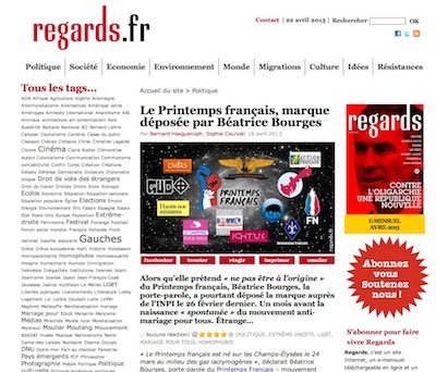 Sur le site regards.fr, Bernard Hasquenoph et Sophie Courval, révèlent la véritable origine du Printemps français, l’organisation qui a mené de nombreuses actions contre le projet de loi pour le mariage gay. Béatrice Bourges, la porte-parole du Printemps français, prétend « ne pas être à l’origine » du mouvement, elle a pourtant déposé la marque auprès de l’INPI le 26 février dernier.