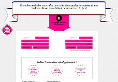 C’est titré « Élu.e homophobe, ton refus de marier des couples homosexuels te rend hors la loi. Mets fin à ce calvaire en 3 clics ! », ça rédige tout seul un courrier de démission, et c’est hilarant !