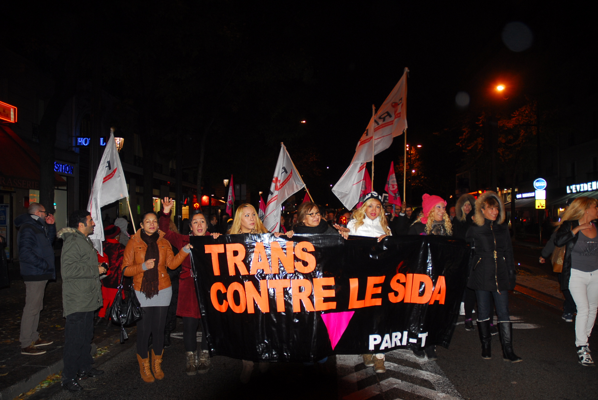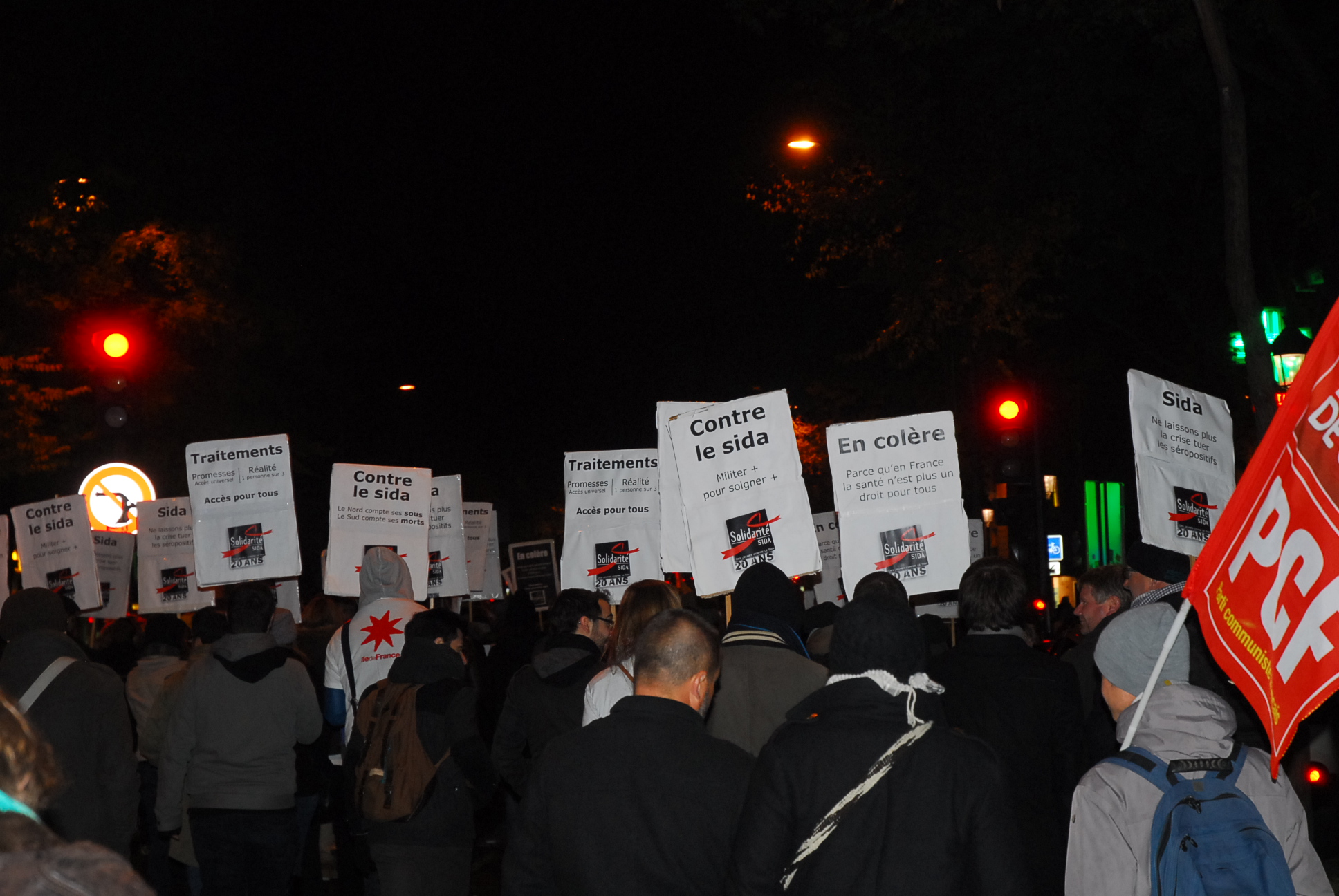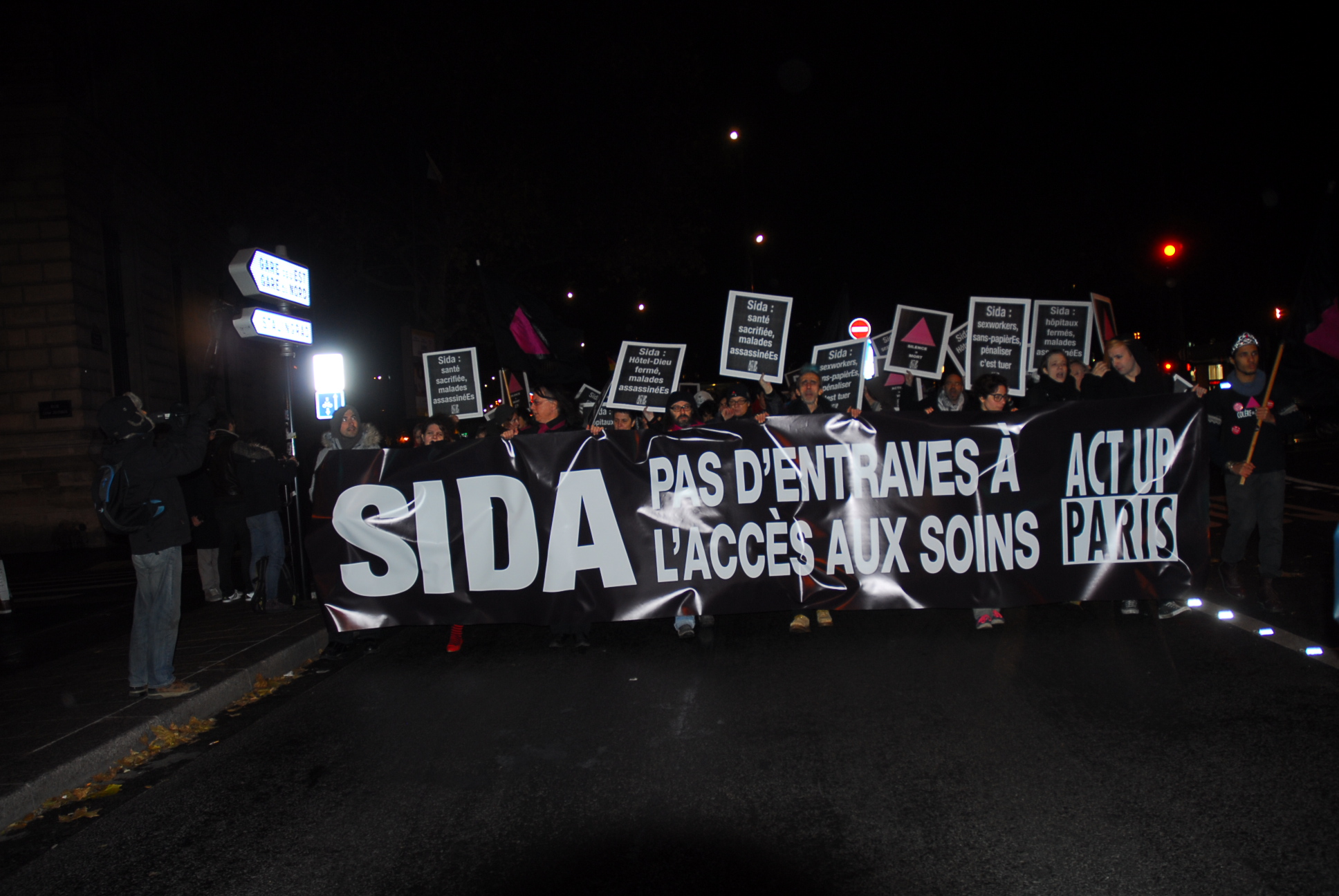 Plusieurs centaines de personnes ont répondu samedi 30 novembre à l’invitation d’Act Up Paris de manifester à l’occasion de la journée mondiale de lutte contre le sida. A l’issue d’un bref discours de la présidente d’Act Up, suivi du déploiement de quelques éléments du patchwork des noms, le cortège s’est ébranlé derrière la banderole rappelant le mot d’ordre « Sida : pas d’entrave à l’accès aux soins ! ».