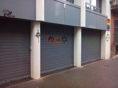 Samedi 15 février dans la nuit, les murs du Centre LGBT de Toulouse et de l’Espace municipal des Diversités de la laïcité ont été odieusement souillés par des inscriptions homophobes et antisémites signées par des croix celtiques et des croix gammées [1].