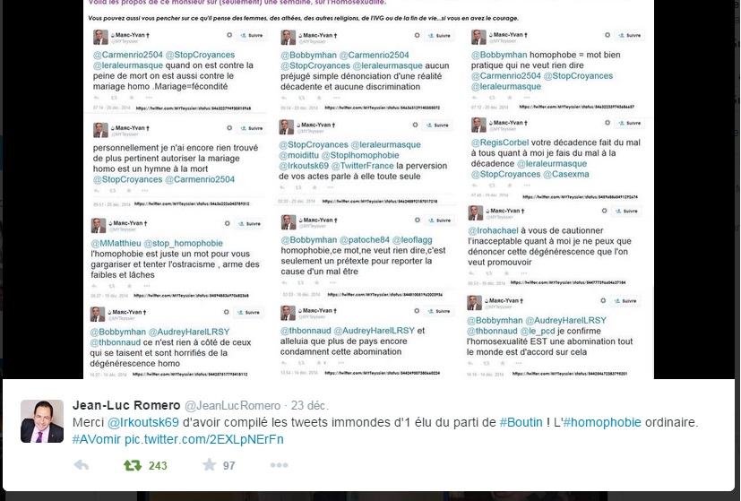 Des propos clairement homophobes et qui ne laissent aucune place au doute. Des propos en totale contrariété avec le rôle d’un élu de la République française dont la devise reste aujourd’hui encore : « Liberté, égalité, fraternité ».