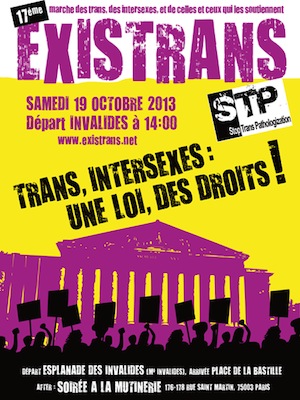 Le Collectif Existrans soutient la campagne internationale Stop Trans Pathologization 2013 dont le mot d’ordre est « Arrêt de la pathologisation des diversités de genre dans l’enfance ».
